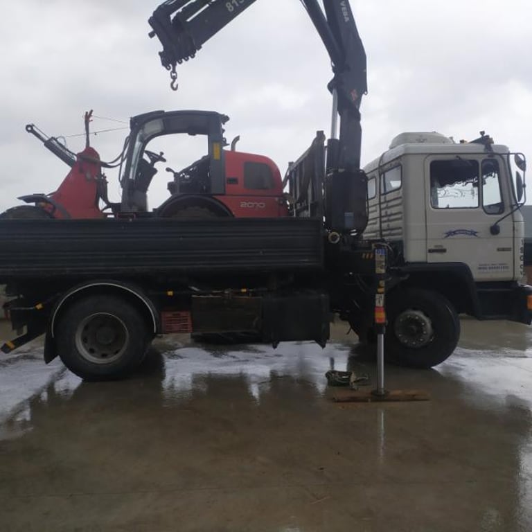 Camión con caja, volquete y grúa para maquinaria y apoyo en obra.