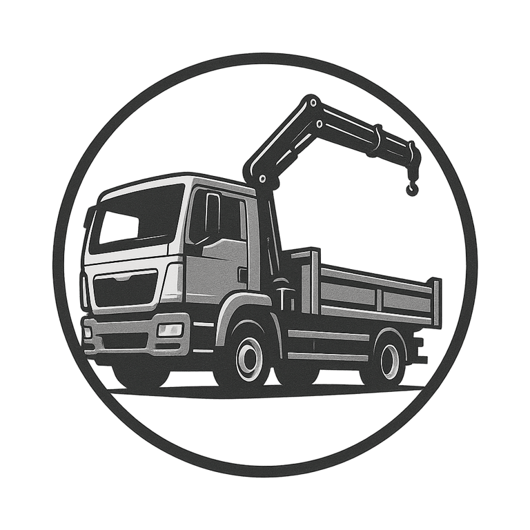 Camión 4x6m, volquete y grúa con alcance de 12 metros para cargas pesadas.